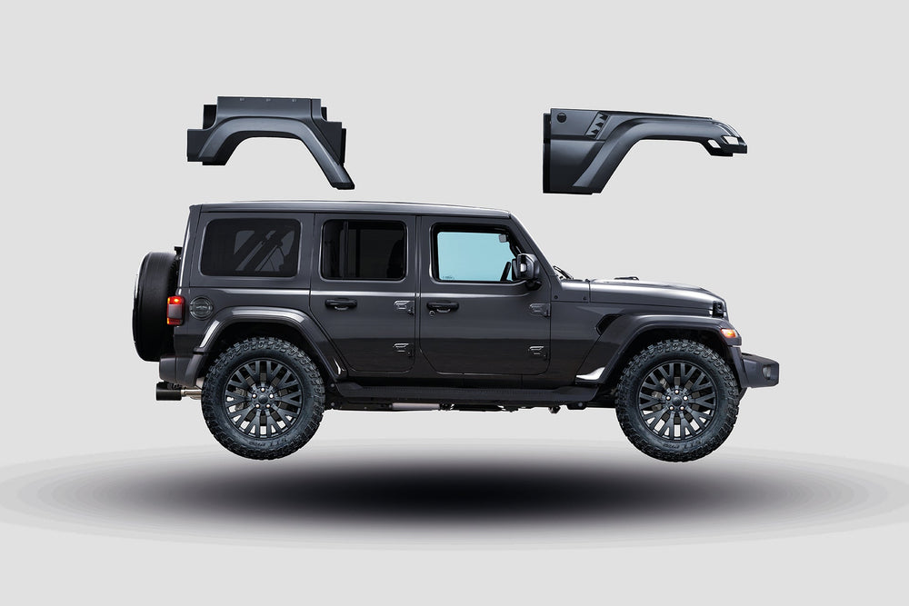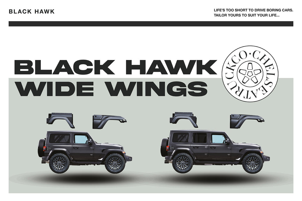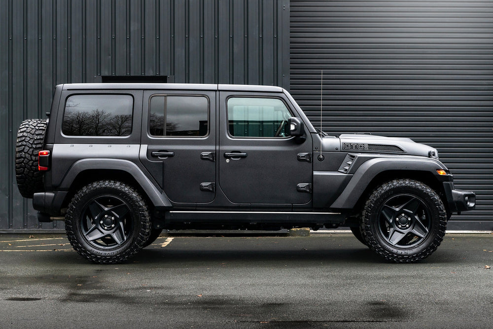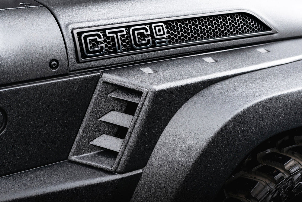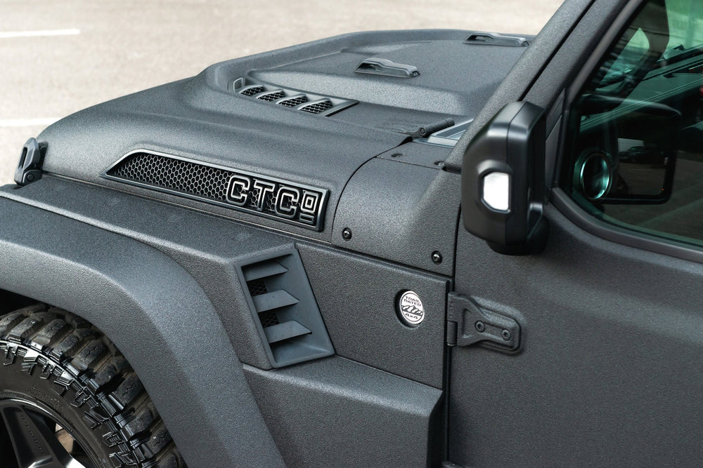 The Black Hawk Bodykit transforms the Wrangler from a laid-back leisure vehicle into a formidable utilitarian powerhouse. Featuring four wide wings with integrated wheel arches, this military-inspired kit is meticulously detailed with vents, bolt apertures, and CTC-branded mesh. The result is a bold, no-nonsense aesthetic that widens the Wrangler’s stance and enhances its commanding presence on the road.