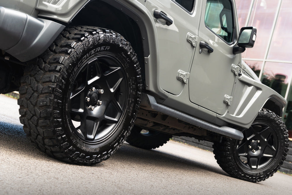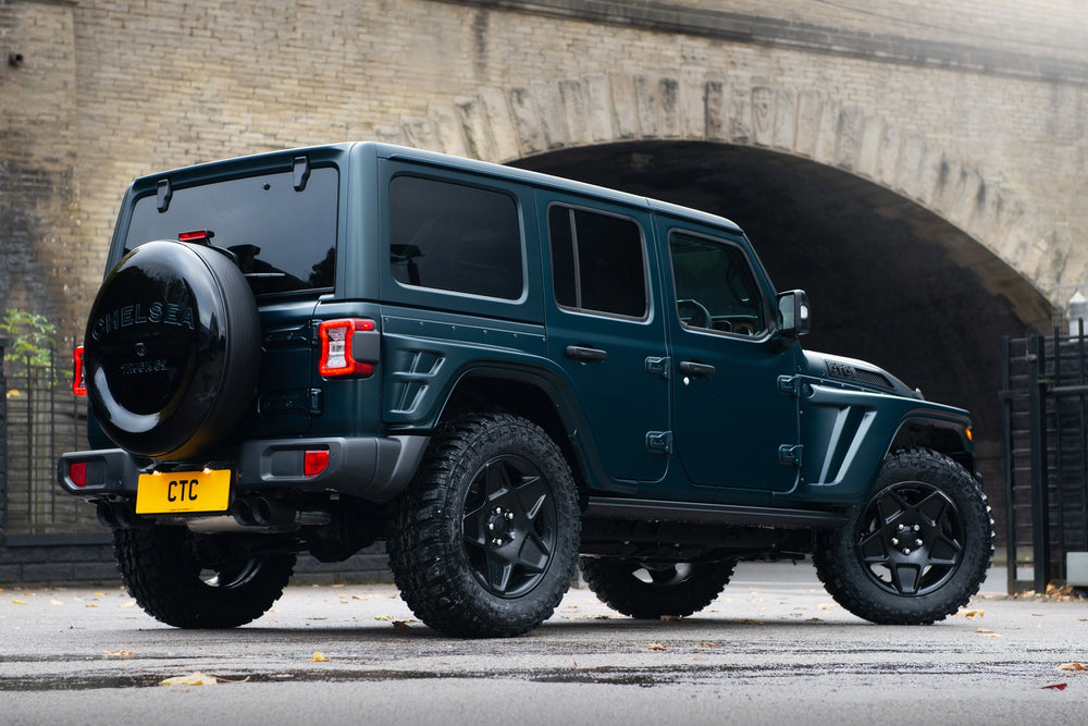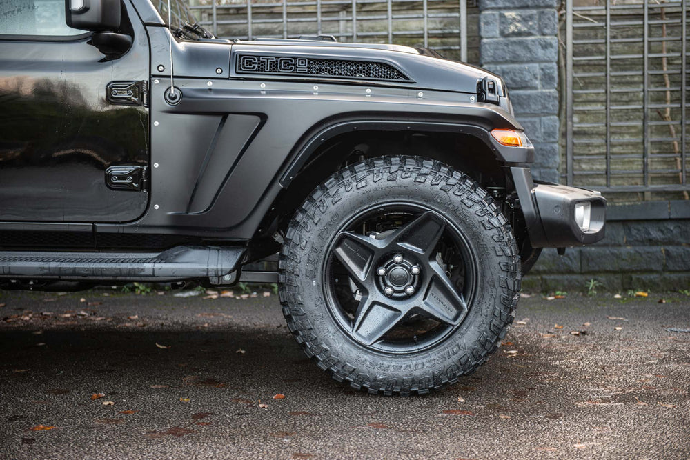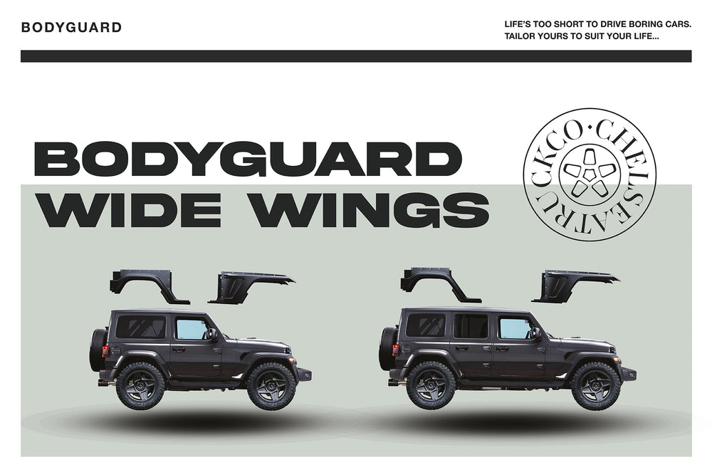 The Bodyguard Bodykit elevates the Wrangler from a relaxed leisure vehicle to a formidable utilitarian powerhouse. With four wide wings featuring distinctive fin details and integrated bolts, this military-inspired kit is meticulously crafted with vents and CTC-branded mesh. The result is a bold, sleek aesthetic that broadens the Wrangler’s stance and amplifies its commanding road presence.