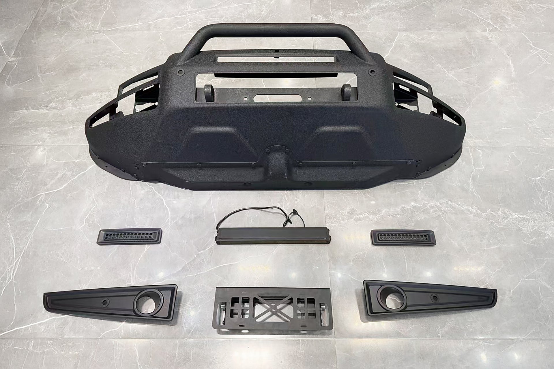 Crafted from premium-grade steel and finished with a 3D-textured military coating, this bumper delivers exceptional durability and a commanding presence. The integrated A-bar enhances both front-end protection and road stance, while auxiliary light mounts improve visibility in low-light environments. Built-in winch-ready mounting points ensure you’re equipped for heavy-duty recovery when tackling extreme terrain.