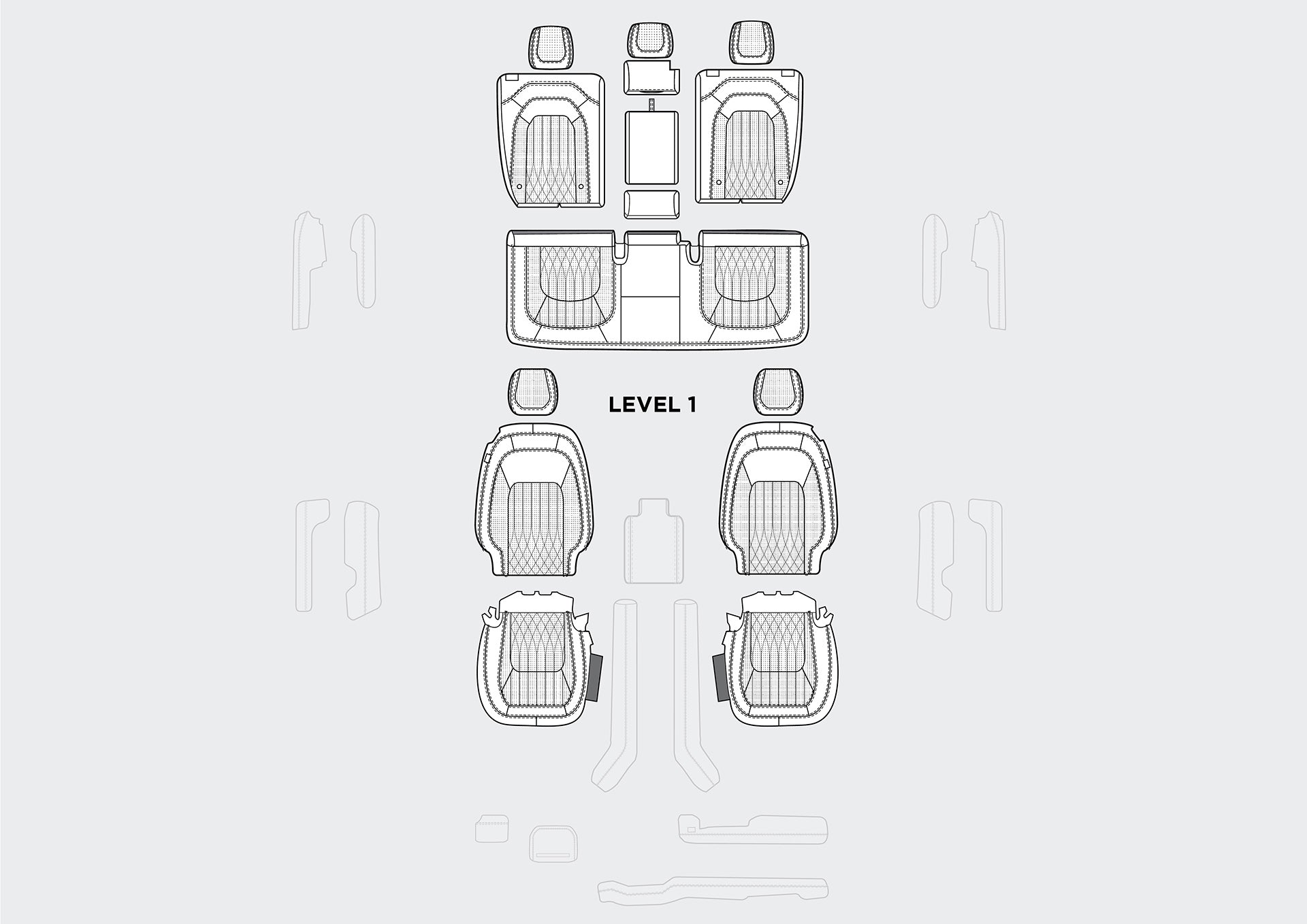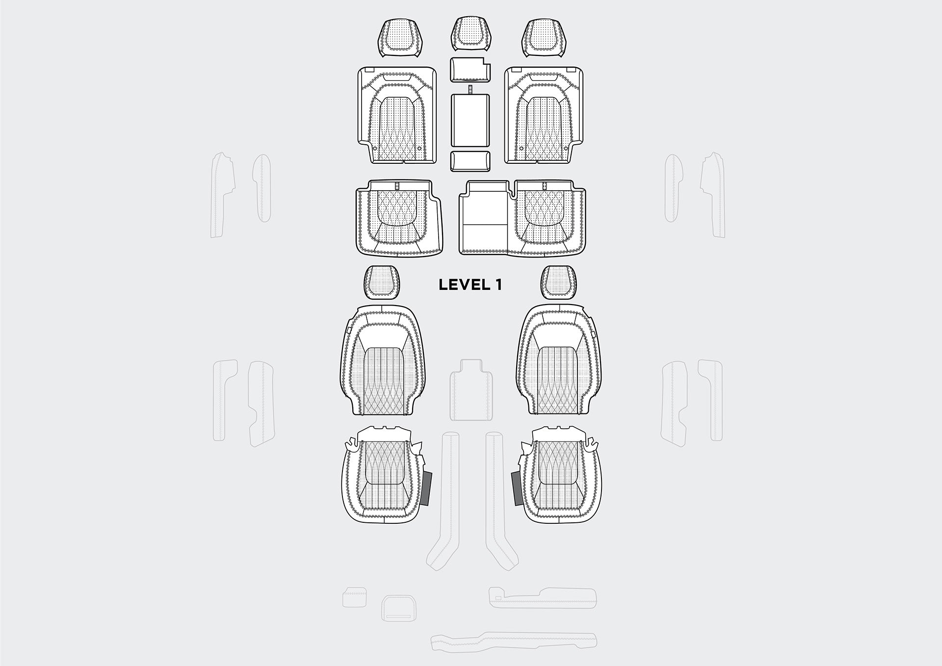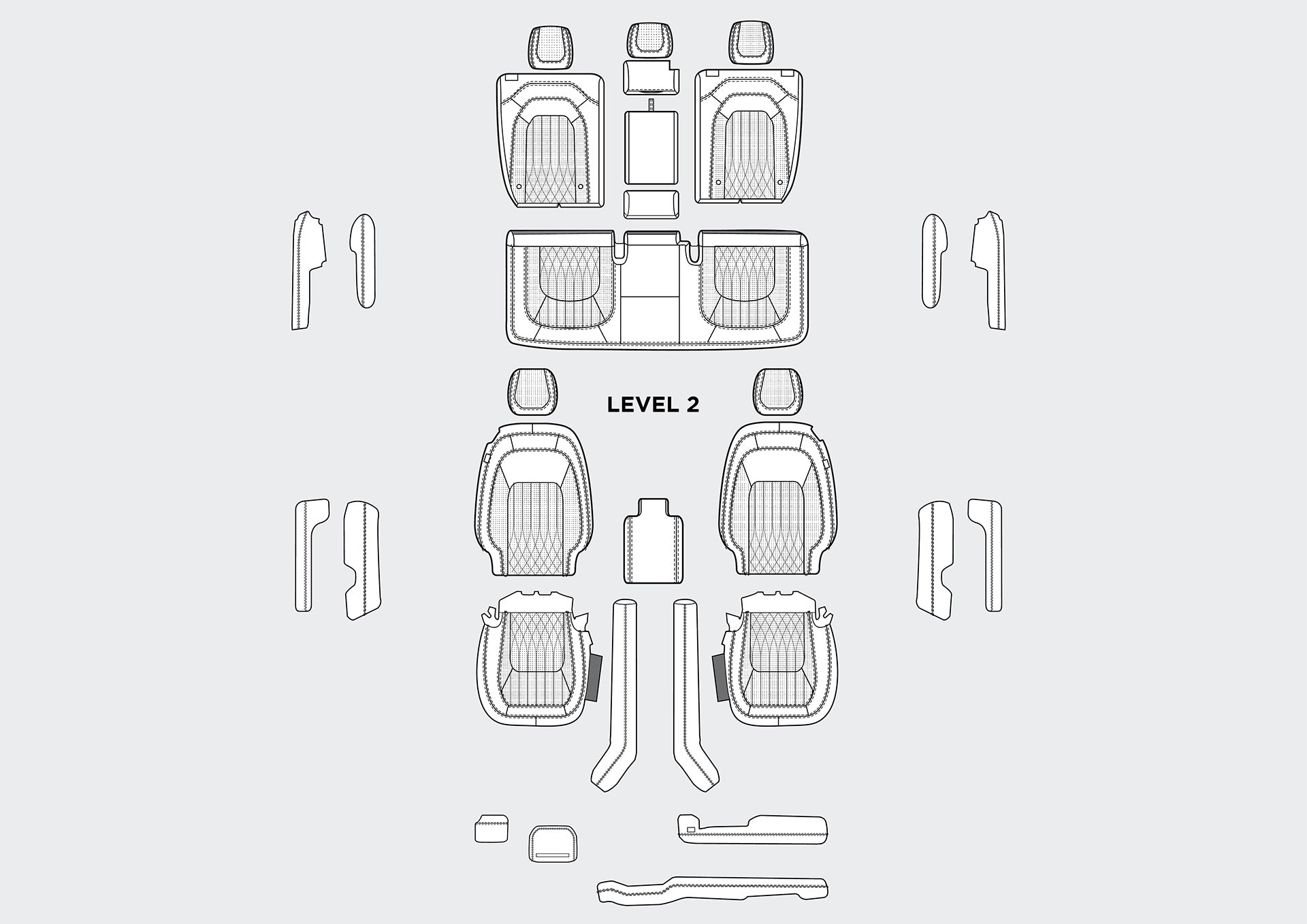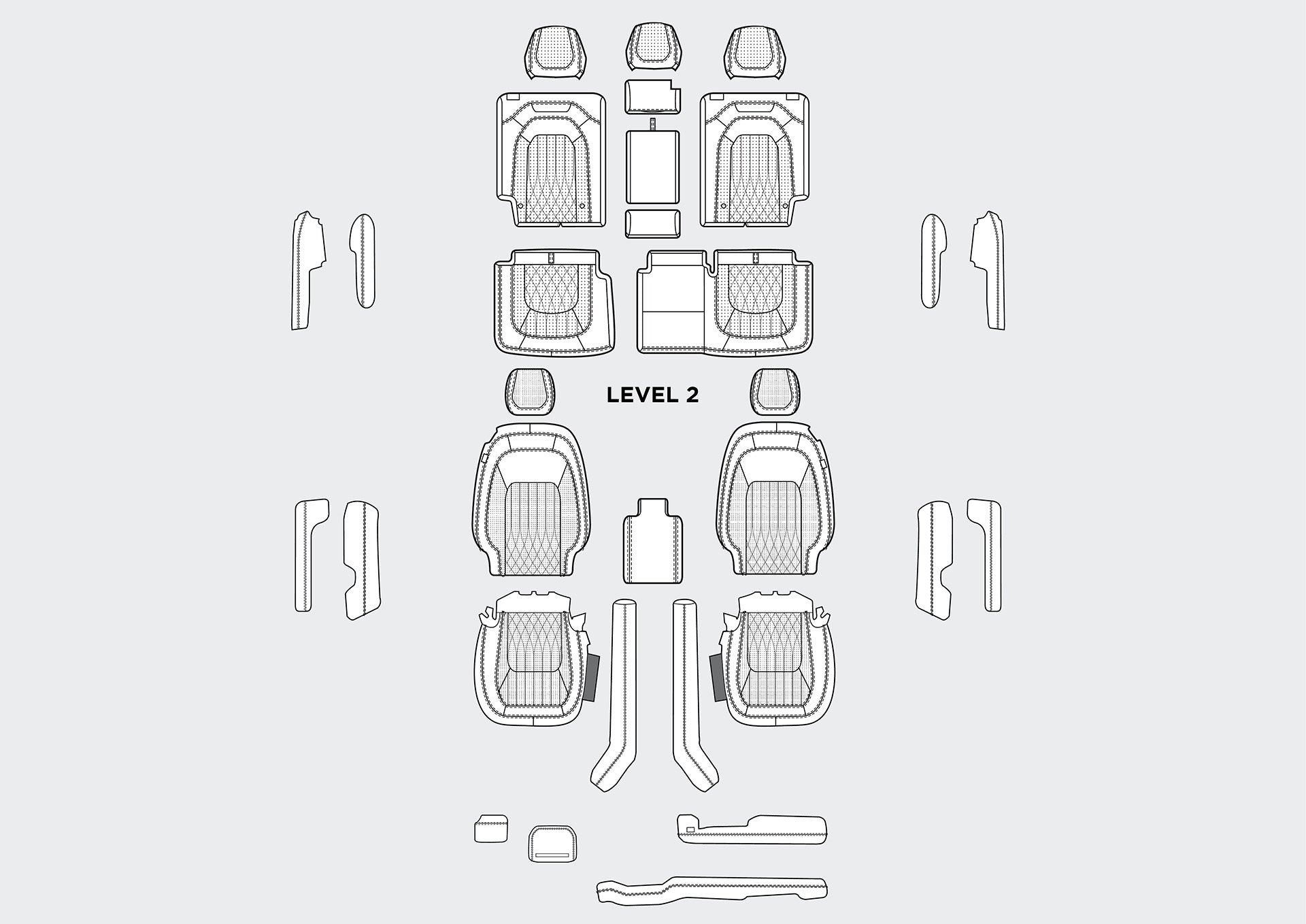 Level 2: All Seats, Upper and Lower Dash, Steering Wheel Centre, Centre Armrest and Hockey Sticks, Front and Rear Door Tops and Armrests