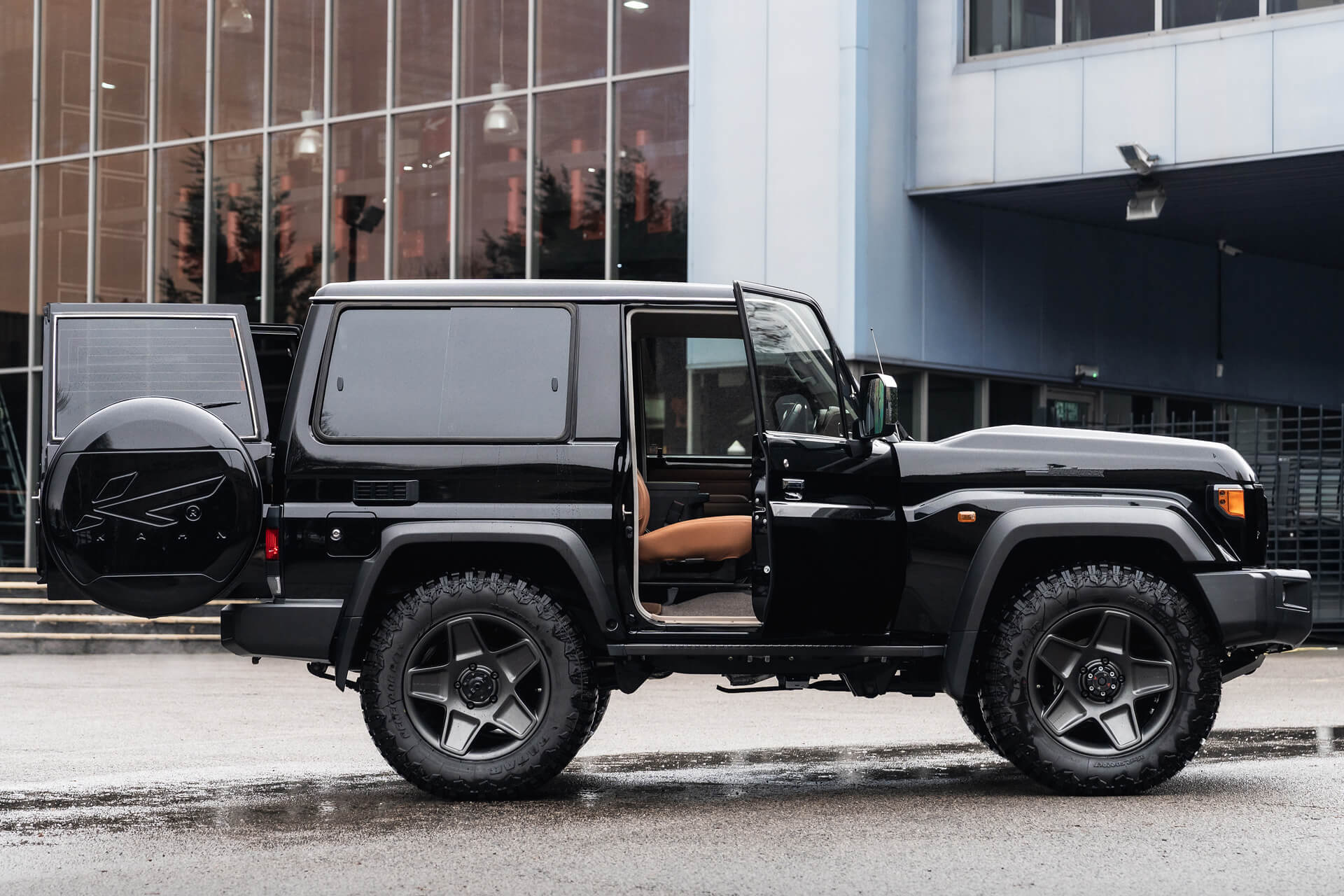 The piano black surface carries an engraved KAHN® logo a precise, subtle detail that reflects the brand’s design language. The fit is tight and seamless, preserving the condition of the spare wheel without adding unnecessary bulk.