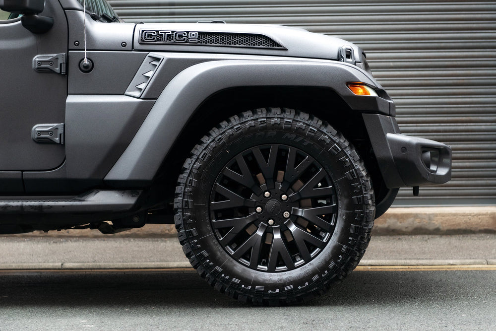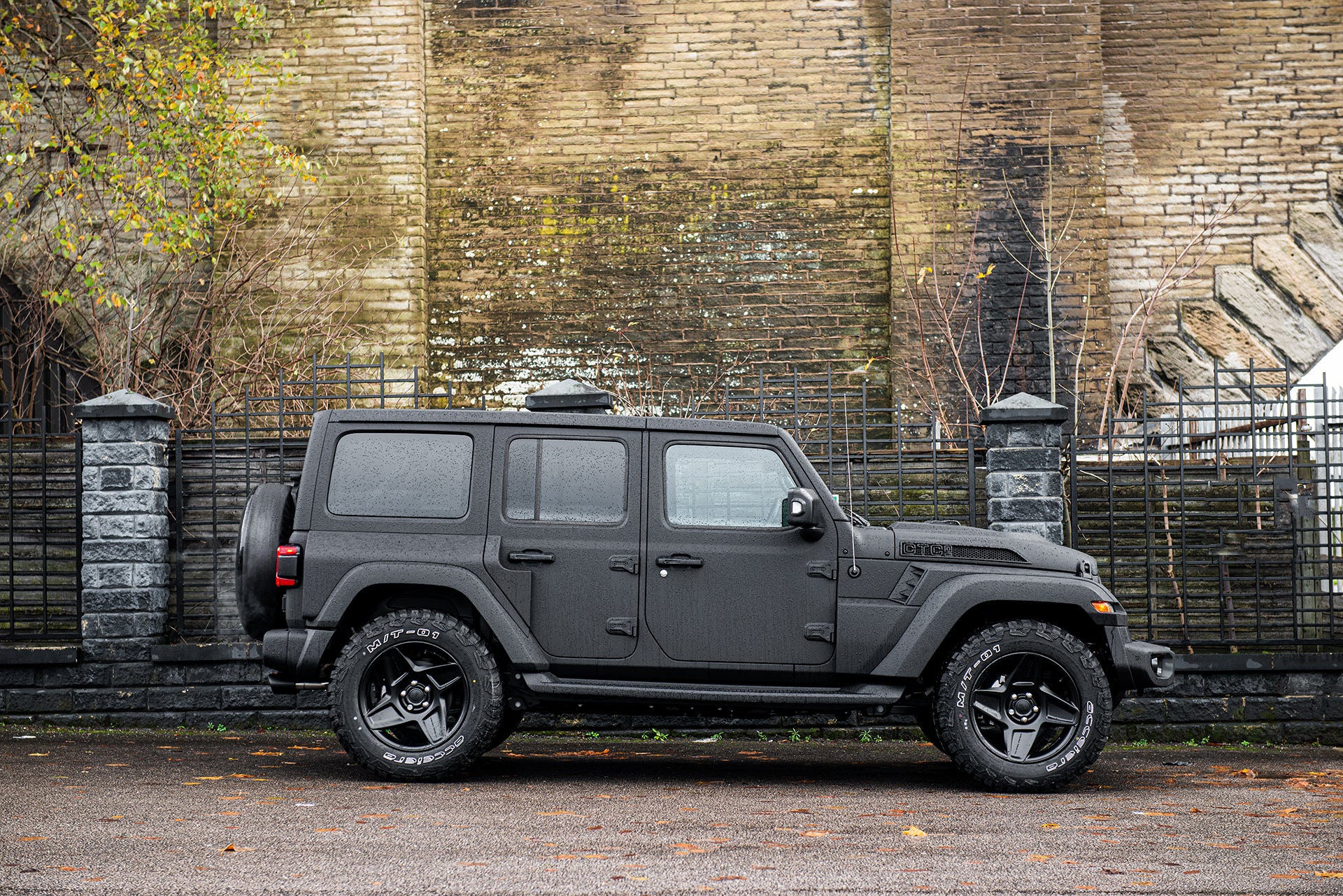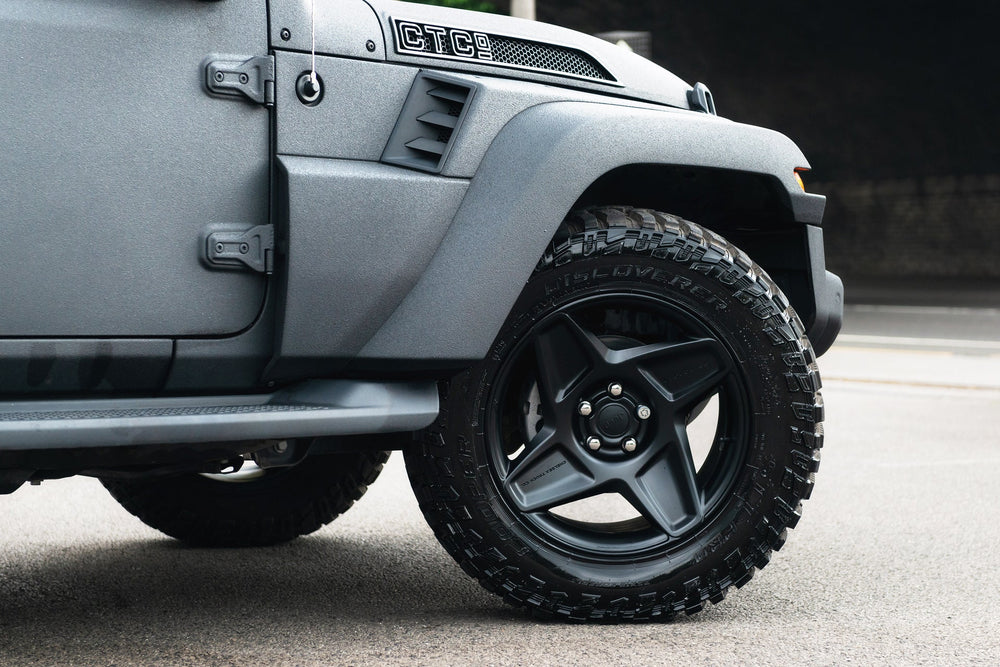 The Black Hawk Bodykit transforms the Wrangler from a laid-back leisure vehicle into a formidable utilitarian powerhouse. Featuring four wide wings with integrated wheel arches, this military-inspired kit is meticulously detailed with vents, bolt apertures, and CTC-branded mesh. The result is a bold, no-nonsense aesthetic that widens the Wrangler’s stance and enhances its commanding presence on the road.