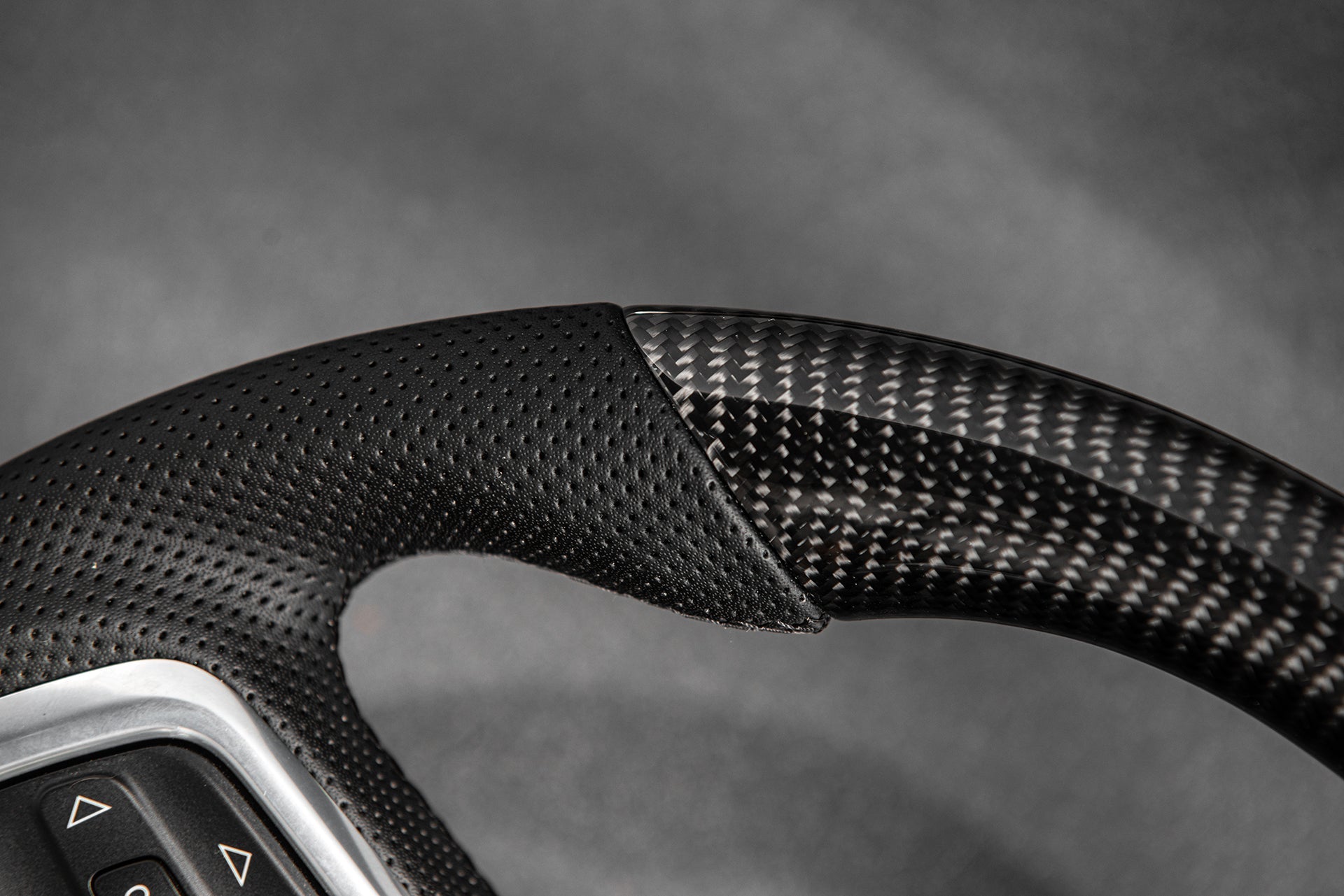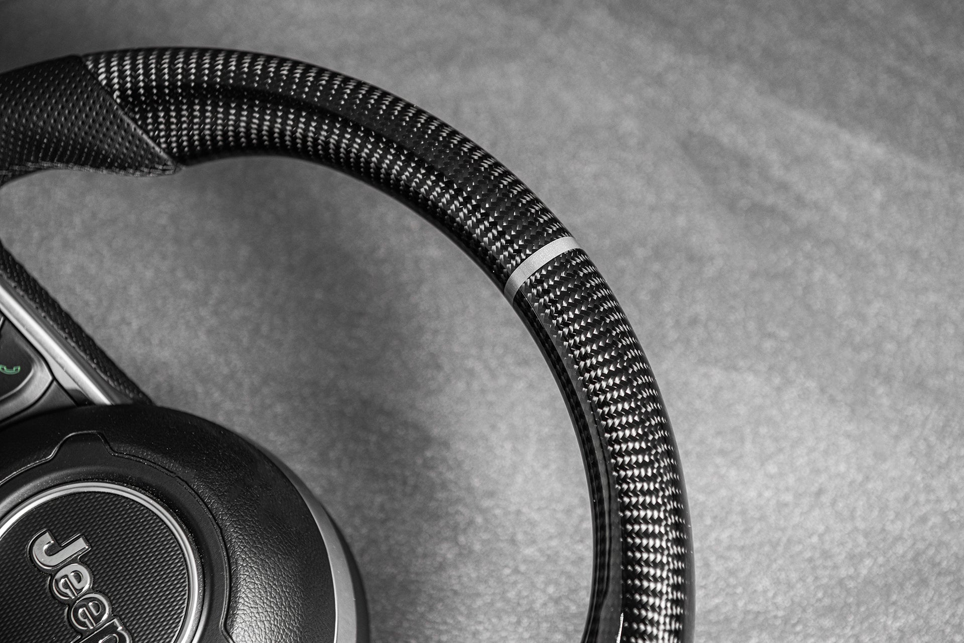 The Chelsea Truck Company Jeep Wrangler JL Carbon Sports Steering Wheel is the epitome of luxury and sophistication. Expertly reupholstered in-house by our skilled engineering team, it embodies refined elegance at its finest.