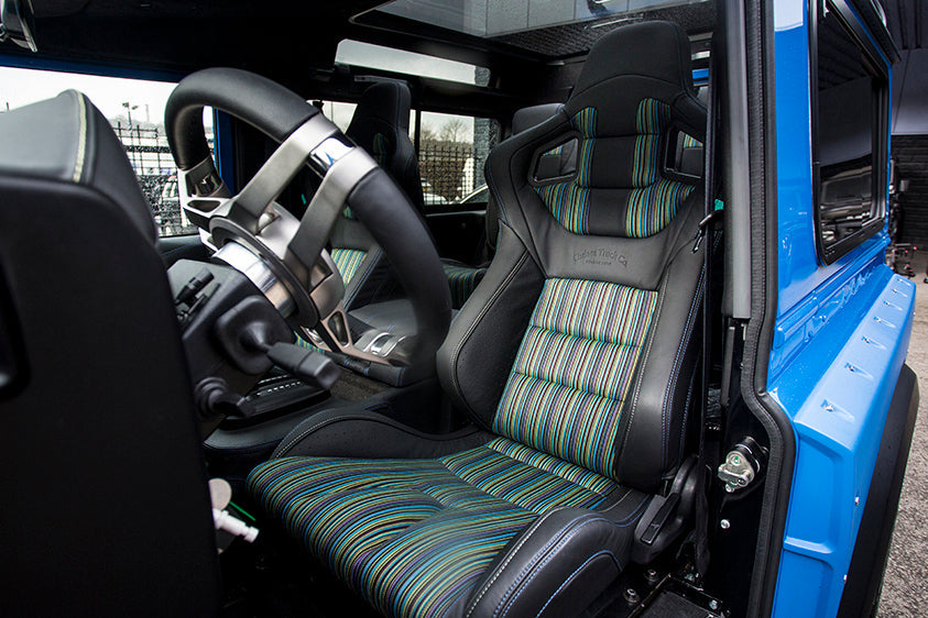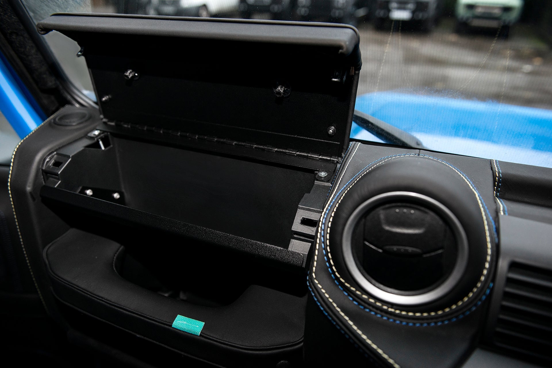 Finished in an eye-catching French Racing Blue, the special edition Defender makes an immediate impression. Its aggressive stance is enhanced by wide track front and rear wings with integrated vents and visible bolt detailing. A black stainless steel front bumper, aluminium sump guard, and TRON-style ring lighting further amplify the off-road aesthetic.
