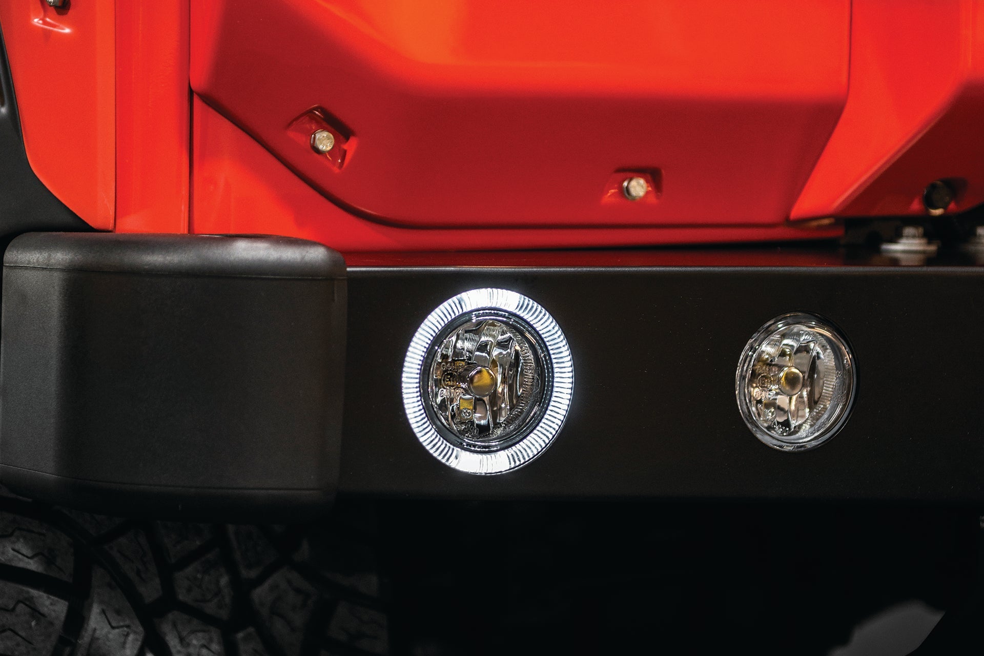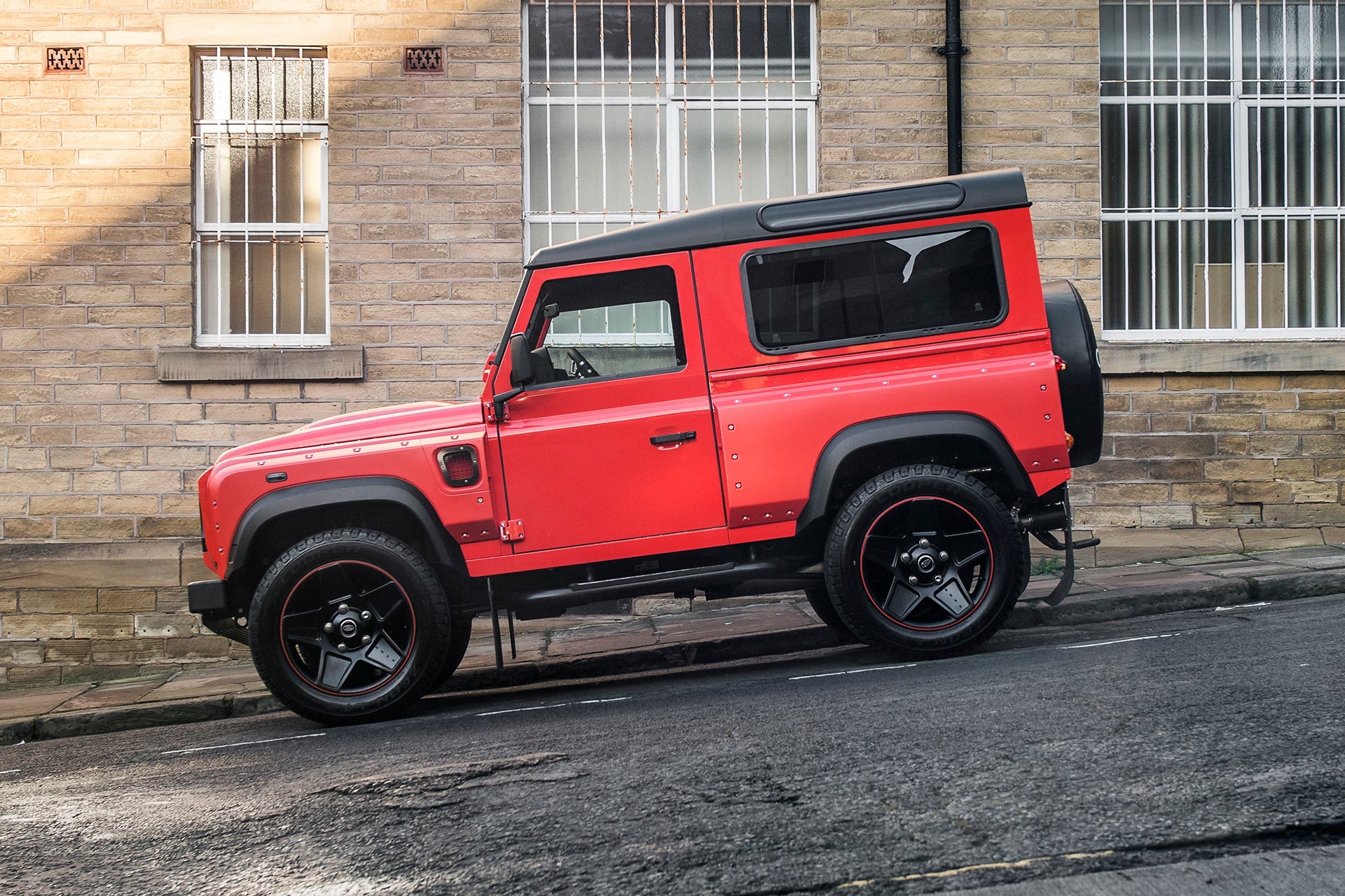 The Defender 90 sits proudly on 20-inch Mondial Retro RS-Forged alloy wheels, finished in Satin Black with a deep concave design and Lava Orange colour-coded accents. Paired with 275/55/20 all-terrain tyres, the setup strikes a perfect balance between urban sophistication and rugged capability.